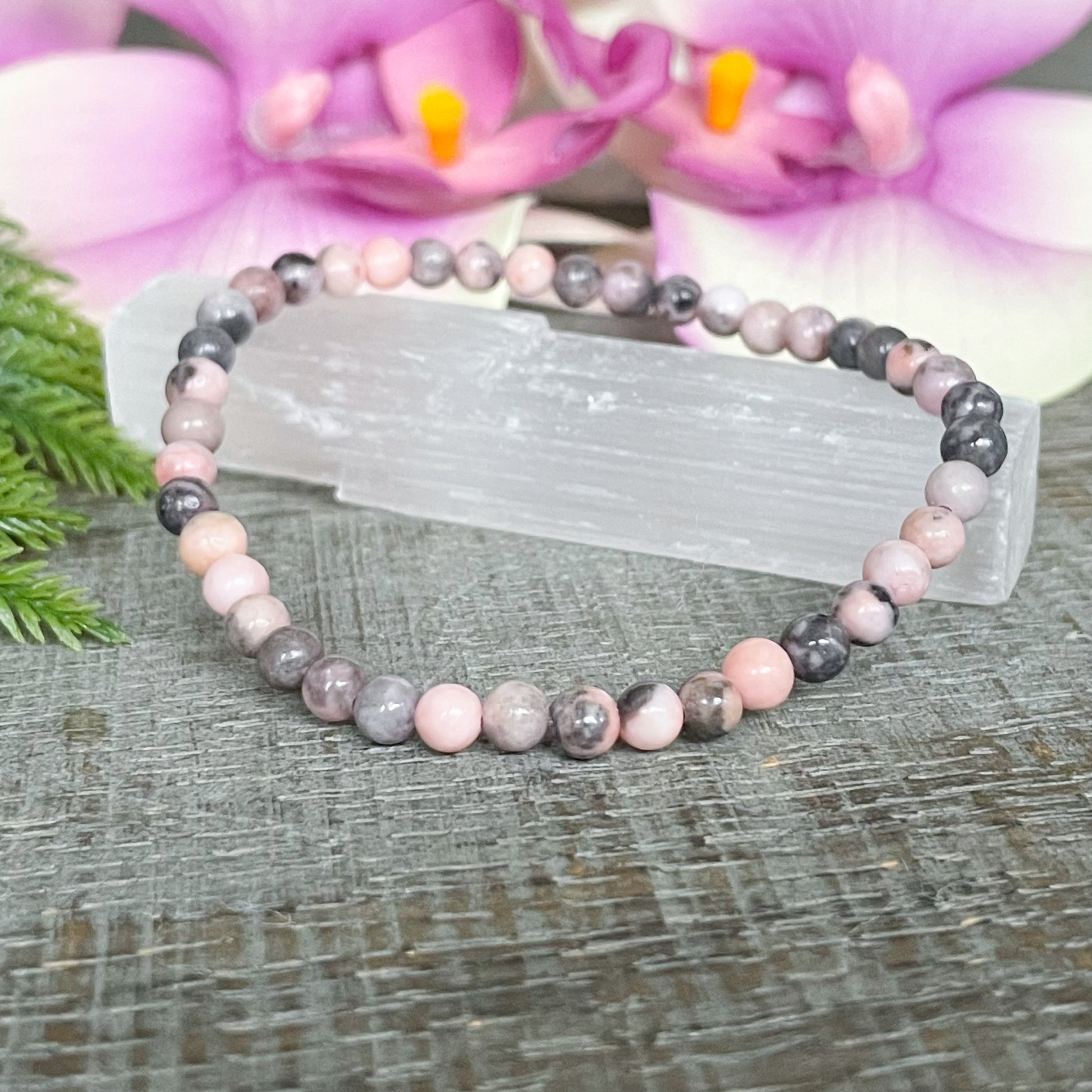 Decrease anxiety and promote calmness with this beautiful & natural pink zebra jasper gemstone bracelet! This beaded mala bracelet features genuine 4mm pink zebra jasper gemstone beads.