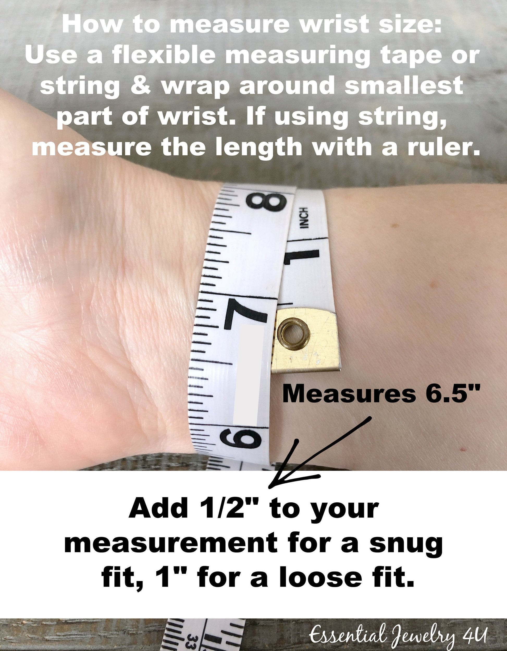 For the best fit please measure your wrist with a tape measure and add 1/2 inch to your measurement if you like your bracelet snug, or add 1 inch if you prefer your bracelet loose. (If you don't have a tape measure, just use a piece of yarn and then measure with a ruler. If you're unsure, the average women's size is 7", men's is 8".)